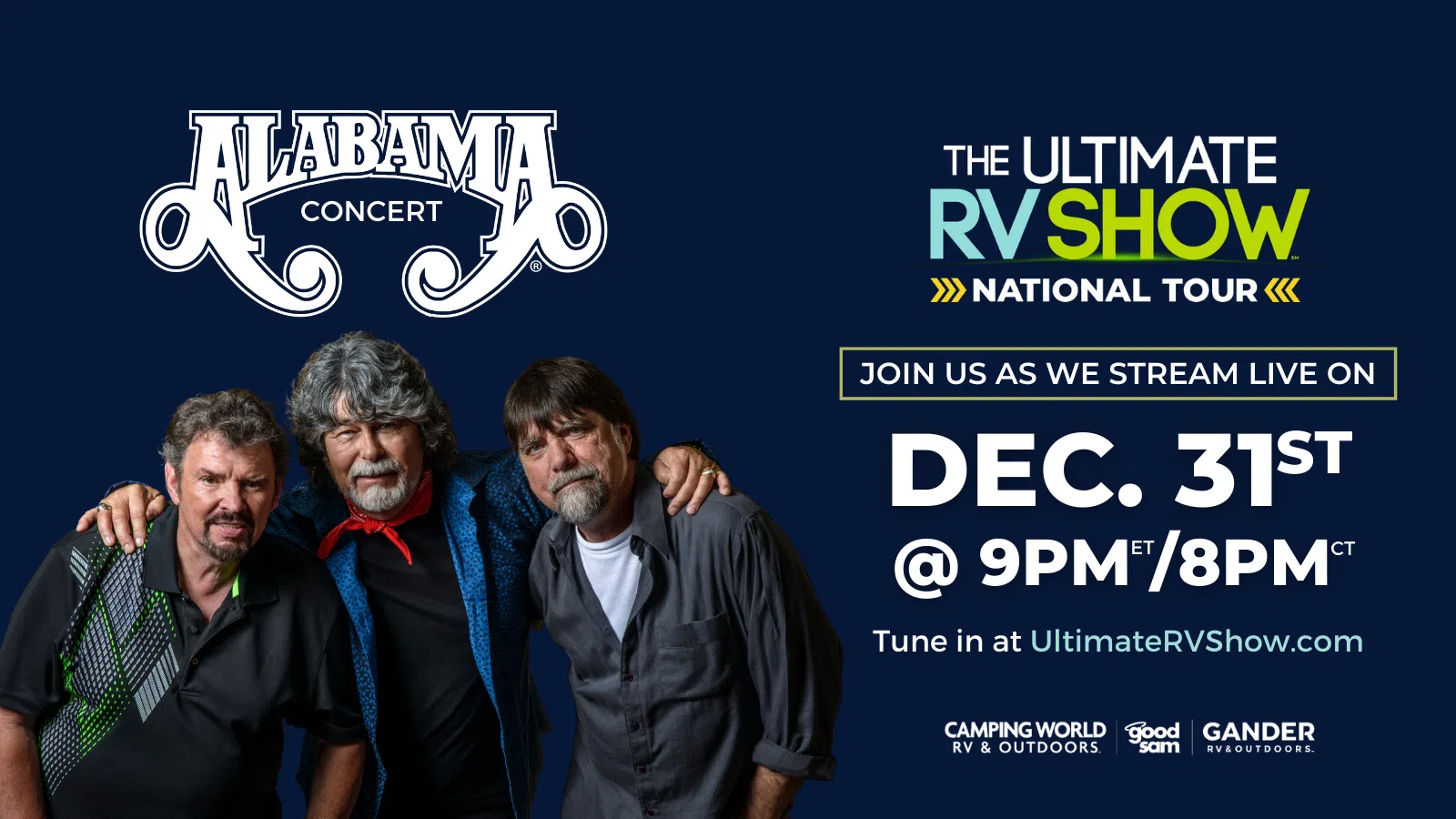 “What better way to start the New Year than to have a free concert on New Year’s Eve for our fans around the world? We are pleased that Marcus Lemonis and our friends at Camping World are presenting this special performance from Nashville, Tennessee. We cannot wait to get back on tour soon, and want to see you in-person. Sit back, relax, crank up the sound and ‘ROLL ON’ into 2021. Wishing you a very happy New Year.”